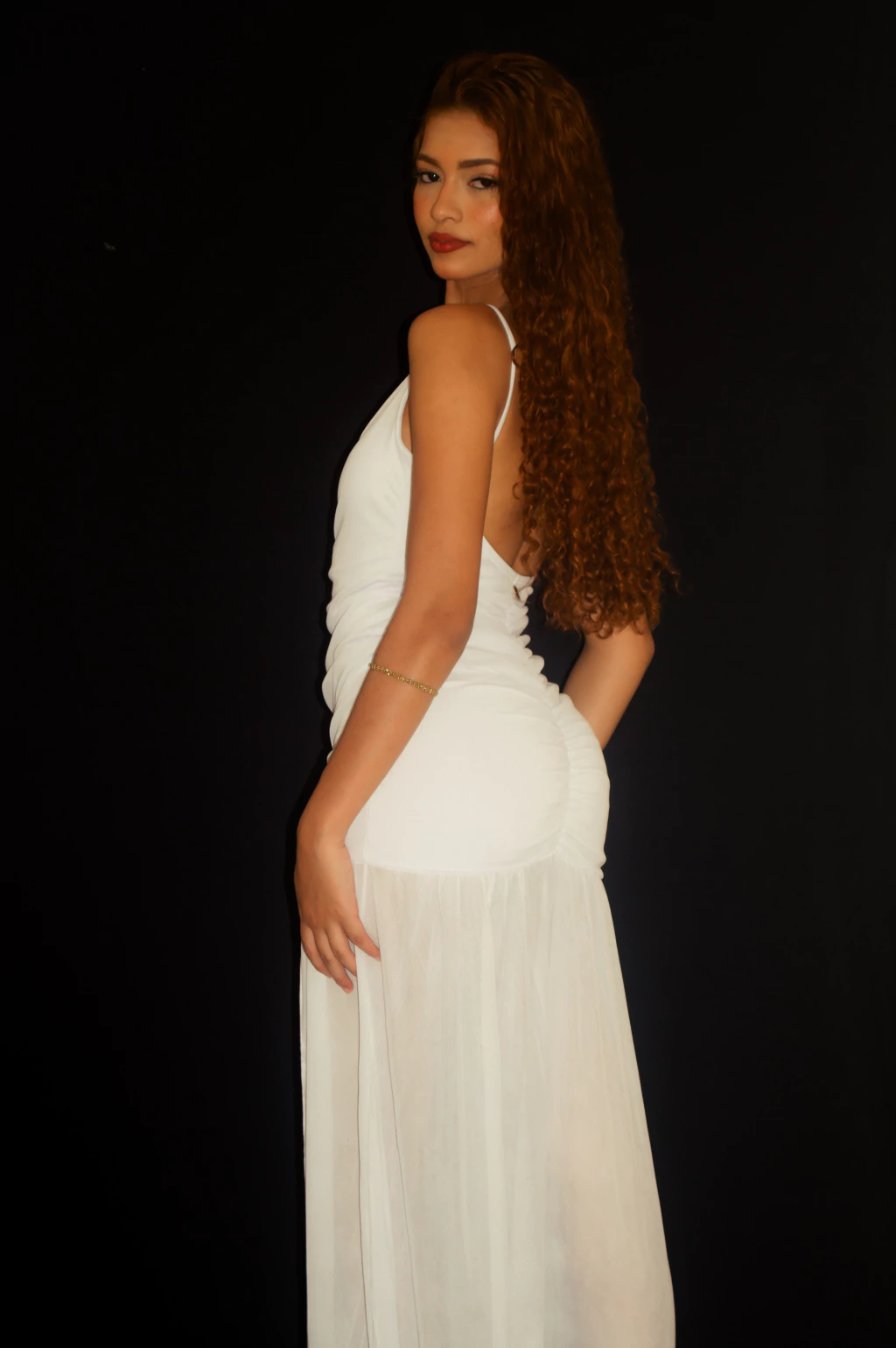 A parte do corpo é totalmente dupla + tule, enquanto a saia de tule possui movimento leve . O detalhe drapeado frontal e traseiro valoriza as curvas de forma natural, e a fenda lateral traz aquele toque irresistível de feminilidade.